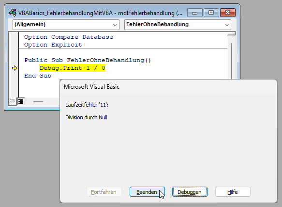 Das klassische Beispiel für einen Laufzeitfehler ist die Division durch 0. Hier haben wir einfach eine Anweisung erstellt, die den Wert 1 durch den Wert 0 dividiert, was zu einem Fehler mit der Nummer 11 und der Fehlermeldung Division durch Null führt.