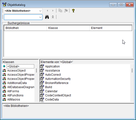 Der Objektkatalog erlaubt das Einsehen verschiedener Elemente, wobei die übergeordneten Elemente die Bibliotheken sind, die in das VBA-Projekt über den Verweise-Dialog eingebunden wurden. Einige Bibliotheken sind in Access standardmäßig eingebunden. Die VBA-Projekte aktueller Access-Versionen wie Access 2021 oder Access aus Office 365 enthalten die folgenden Bibliotheken: