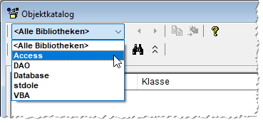 Wenn wir im Objektkatalog das Auswahlfeld oben links öffnen, finden wir Einträge vor, die diesen Bibliotheken entsprechen (siehe Bild 3). Zusätzlich finden wir hier noch den Eintrag Database.